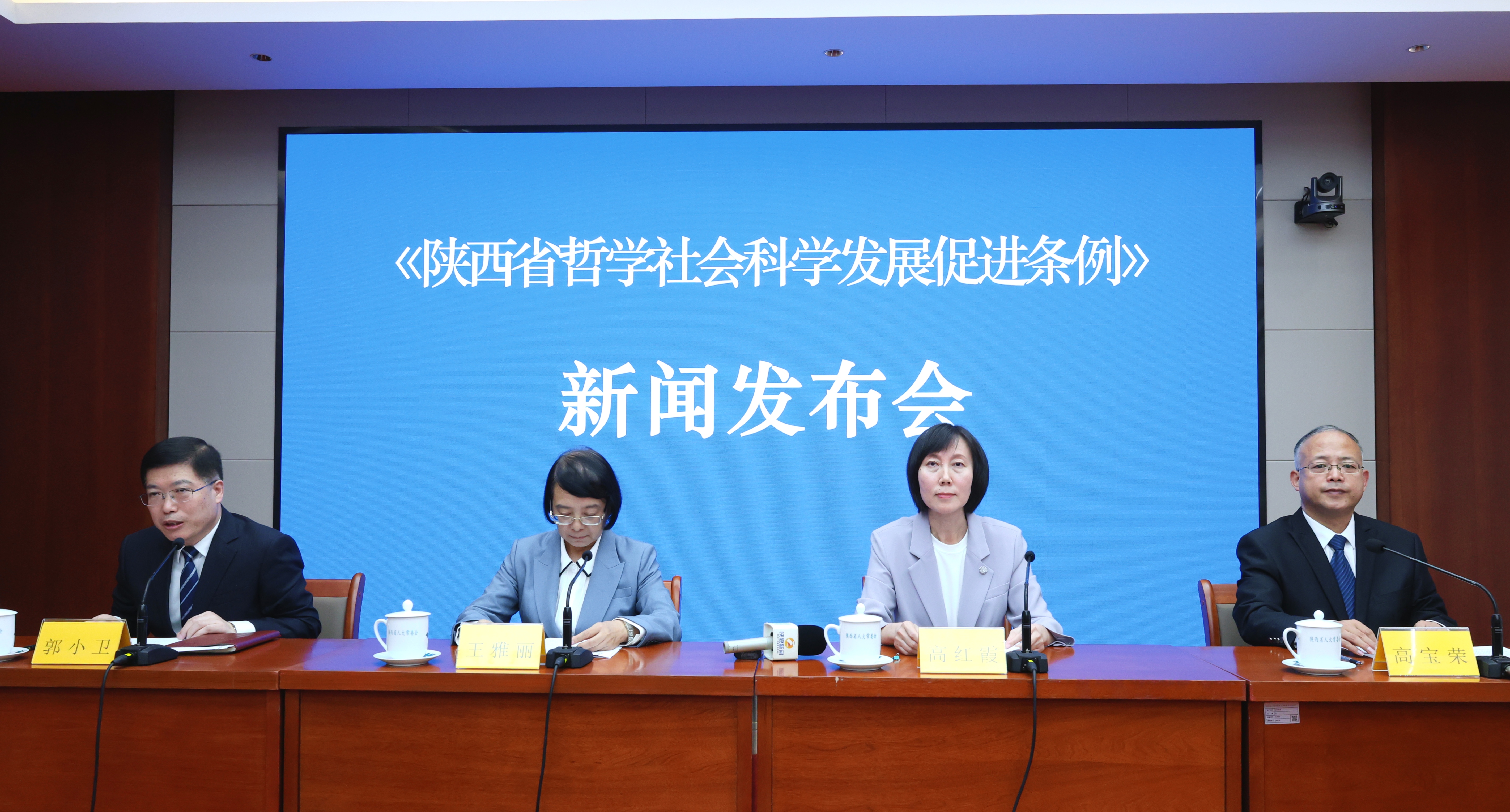 9月29日,省人大常委会举行《陕西省哲学社会科学发展促进条例》(以下简称《条例》)颁布实施新闻发布会,省人大常委会法工委副主任王雅丽、省社会科学界联合会常务副主席高红霞作新闻发布,省人大常委会副秘书长郭小卫主持。
